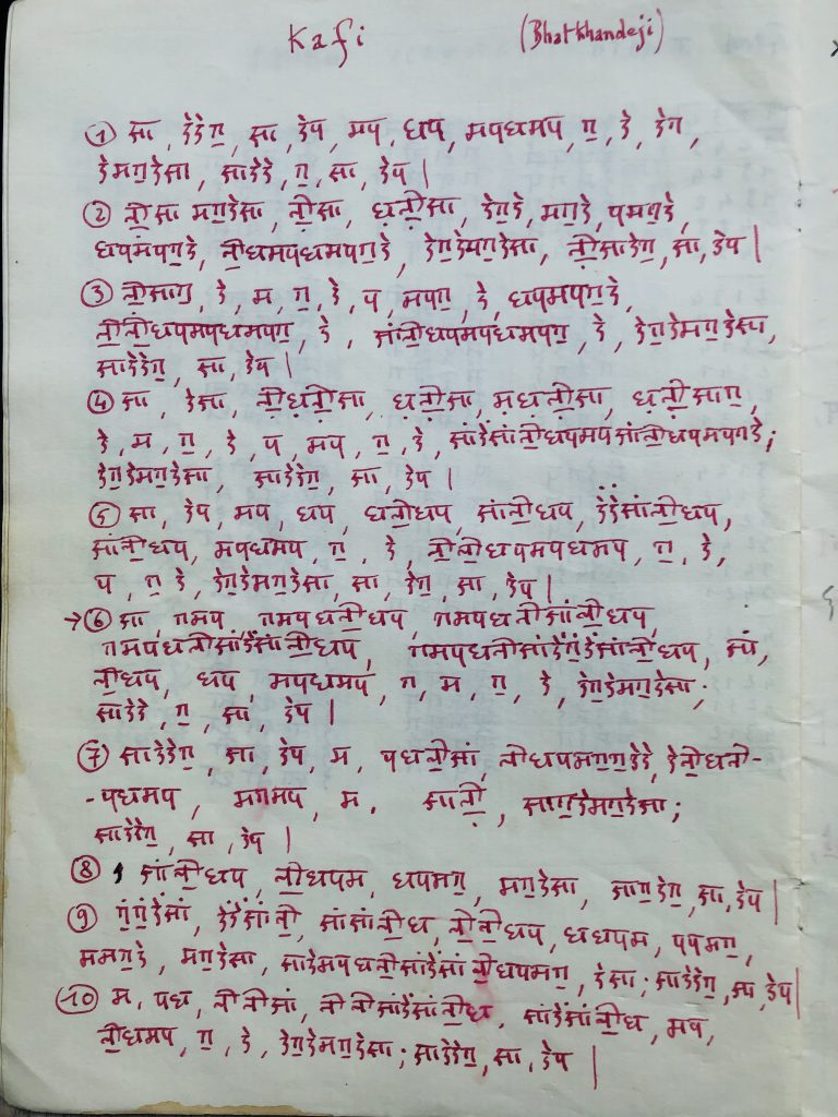 Musique d’Inde du Nord, copie d’une étude du Raga « Kafi » de Vishnu Narayan Bhatkhande. J’avais étudié pendant trois an en auditeur libre la musique indienne au conservatoire de Paris avec Patrick Moutal